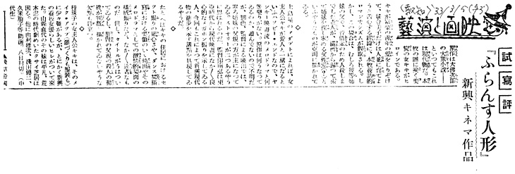 | 小説のタイトル | 試写評/「ふらんす人形」(新興キネマ作品) |