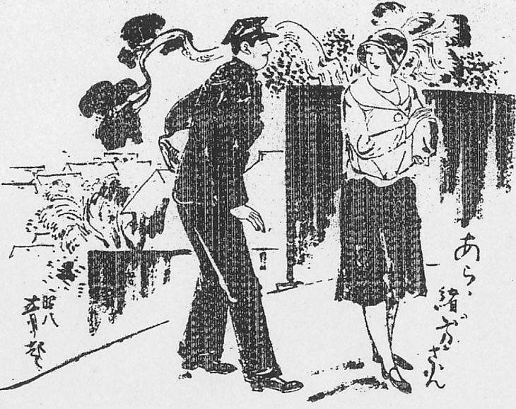 | 説明 | 大学生と女子大生だが、二人とも家庭教師として、ある金持ちの家に住み込んでいる。女性の方はこの時代の若い女性のふつうの外出着で、クローシュを少しアミダに被っているのは、家庭教師の身分という立場上当然だろう。男の方は角帽に詰め襟の学生服で、戦前は洋服であれば、このスタイル以外で校門をくぐることは許されなかった。第二次世界大戦後はその規制は外されたが、1955(昭和30)年くらいまでは、たいていの学生は制服・制帽だった。制帽はともかく、黒い詰め襟の制服は、ぼろ隠しにもなったし、この方が安上がりだったからだ。制服は着替えがないのがふつうだったから、洗濯をすることなど滅多になく、そばへ寄ると独特の「制服臭」のするものが多かった。その点は程度こそちがえ、女学生のセーラー服の制服や、海老茶のカシミヤ、セルの袴も変わりない。(大丸 弘) |