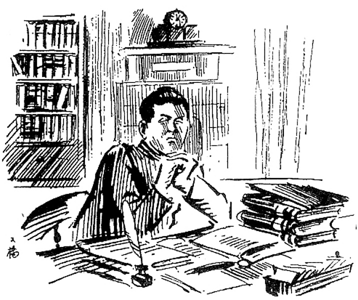 | キーワード | 学徒;詰襟;肘(ひじ)を突く;大学の研究室;机;本;インク壺;本棚;置き時計 |