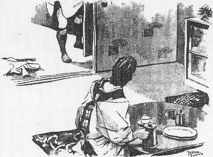 説明 吉屋信子の評判作品。人気を獲得したのは、妻に対する心遣いをまったくと言ってよいほど欠いた良人の丹念な描写が、満天下の女性読者の共感を得たのか。この挿絵では茶の間で朝食の用意をする妻の背中と、隣室の洋服箪笥の前で、出かける支度をしている良人の脚だけを鳥瞰的に描いて、意を尽くしている。洋服箪笥の鏡に向かってネクタイを結んでいる良人。その隣は妻の邦子の箪笥、と言っているが和箪笥だろう。洋服箪笥の普及しはじめたのは東京でも震災後で、それ以前は洋服でも吊して保存する、という習慣はなかった。麻の夏ズボンをめぐる夫婦のやりとりの内容から察すれば、いま使っている洋服は洋服箪笥の中に吊しておき、季節外のものはナフタリンを入れた箱に入れて、押し入れにしまう、というのがこの家の整理法であるらしい。たいていの衣装箱はズボンをそのまま入れるには長さが足りないから、少なくとも一カ所で折り曲げなければならない。良人が、「むやみと小さく畳んじゃ駄目じゃないか」と叱っているが、そういうことよりも、なにを着ようという、良人が考えている自分の服装計画と、妻の方の都合との食いちがいが問題。(大丸 弘)