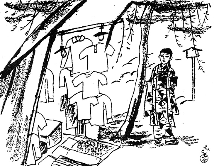 | 説明 | 浅草六区。夜店の人混みの中で、人と会うために立っている駆け出し女優。「麻の葉模様の銘仙を着て、真っ赤な帯揚げを、初々しく胸高に結んでいた。髪は、お下げの組み分け(……)」というのは、そんな職業にしては少女っぽい。若い子ほど、半襟よりも鹿の子絞りなどの帯揚げを胸元のフィーチャーとする。銘仙は絹物としてはもっともふだん着的に用いられた。この時代になると銘仙といっても幅が広くなって、値段の格差も大きくなっている。吊しの古着のそばで人を待っている小娘では、かなり安物の、派手な色合いのものだろう。(大丸 弘) |