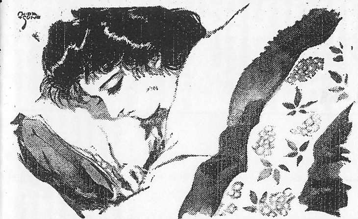 説明 第7回は、抱え主の家を飛び出してきた芸者。第9回は、前代議士家の小間使い。第26回はその前代議士夫人。この時期の代表的美人画家小林秀恒による、美人の表現でいちばん気づくことは、睫毛(マツゲ)の強調、あるいは誇張だろう。目を大きく、あるいはパッチリ見せるためには、瞼に濃い線を入れてもうひとつの輪郭をつくるのがいちばん簡単な方法だが、さらにもうひとつ欲が出て、ただ大きいだけでなく、もう少し情のある目、物言いたげな目にしたい、というような注文に添うのが、目の周りに陰をつくる工夫だ。アイシャドウも長い睫毛も効果はちがうがこの注文に添っている。そのため、この芸者や小間使いのようにやや伏し目になっていると、黒く塗り潰したように見える。西洋人は一般に日本人より長い睫毛を持っているので、長い睫毛はまた、ある程度は西洋人くさい顔に見せる役にも立つ。(大丸 弘)