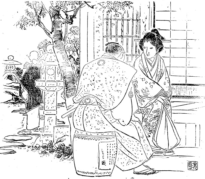 キーワード 霰小紋(あられこもん)の裃(かみしも);上下;紋付き;後ろ姿;背面;眉落とし;坊主;灯籠;飛び石;縁側;庭用丸椅子