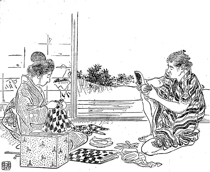 キーワード ごろつき;刺青;入れ墨;袖まくり;立て膝;包丁;果物の皮を剥く;武士の妻;紋付き;針仕事;裁縫箱;針山;破れ障子