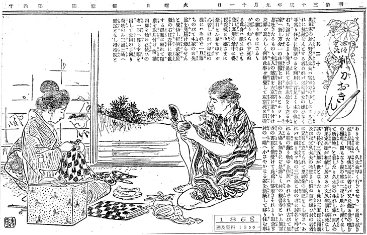 説明 〈遡及資料〉[都新聞]の実録探偵シリーズのひとつで、筆者は名前を出していないが、元警視庁刑事の高谷為之。探偵シリーズはそれまで中編の読み物だったのが、本作の197回、約半年続いたというのはそれまでに例がなく、読者の支持の大きかったことのひとつの証拠になる。物語の1868(明治元)年頃は約三十年前で、画家・松本洗耳には自身の見聞はないが、当時の新聞小説の読者からは、とりわけこうした評判の作品というと、風俗の上での些細なまちがいにも厳しいクレームがあったから、その絵の内容はほぼ信じてよいだろう。幕府の瓦解のために田舎に身を隠しているもと旗本の妻女と、その機嫌を取って真桑瓜(マクワウリ)の皮をむく土地のごろつき。(大丸 弘)