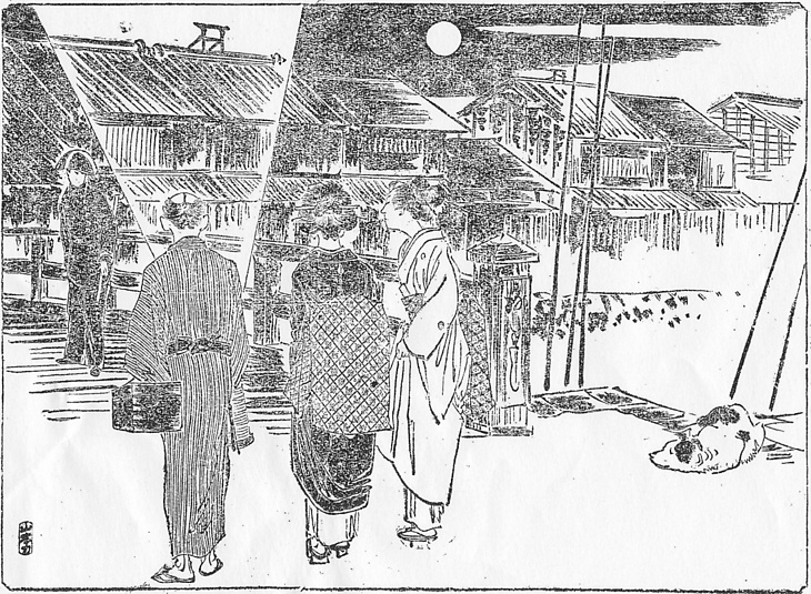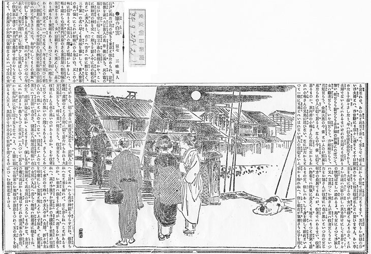 説明 〈遡及資料〉東京両国橋に近い、柳橋の袂に佇んでいるふたりの芸者と、提灯を手にした箱屋と思われる男。この日の本文の内容とこの挿絵とは関係ない。東京市中の主要な橋は維新後つぎつぎと木橋から鋼鉄橋に架け替えられたので、年代判定のよい手がかりになる。柳橋が鉄橋になったのは1887(明治20)年のことだったから、この絵の時代である1868(明治元)年からはまだ遠い先。ただし橋の半ばでこちらを窺っている警官風の男はすこし問題。東京府内警備のため三千人のポリスが任命されたのは1869(明治2)年のことだが、邏卒(ラソツ)という名称を与えられ、三尺の警棒や、ナポレオン帽風の紺羅紗の山型帽等が制定されたのはさらに数年後のことになる(→年表〈事件〉1874年2月 「巡査の制服制帽制定」郵便報知新聞 1874年2月13日1面)。右側の白っぽい衣裳の芸者の髪は潰し島田のように見える。この女の着付けはずいぶんゆるく、胸元に今だったらとても許されないようなたるみ皺が見える。小さな絵ではあり、右田年英はそう念入りに描いているというわけでもないが、当時のきものの着方がよくとらえられている。(大丸 弘)