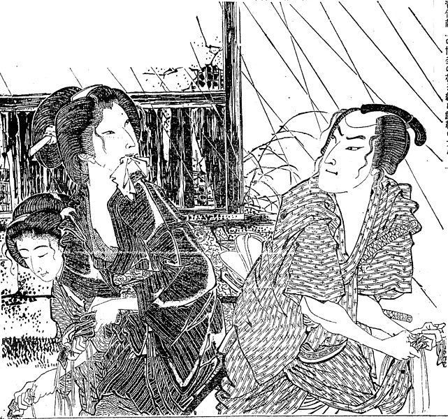 | 説明 | 〈遡及資料〉東京に比べて大阪の大新聞は読み物の掲載に熱心で、中でも大阪朝日は明治十年代前半から歌川派等の浮世絵師を起用して絵入りの小説を連載している。この絵にしても、画家にとってまだ二十年も経っていない時代の風俗の遡及だから、じゅうぶんな信憑性があるだろう。冒頭の細かい衣裳付けに対して、忠実な絵柄になっている。もっとも、全体といい、登場人物の顔といい、これはあくまで舞台仕立てだ。「(……)一人の女あり、年頃は二十一,二歳、紺染めの明石縮の単衣を着け、お納戸繻子の丸帯を結びたるが紅粉を用いざれども自然の艶色楚々として人を動かすに足り、宛ら白蓮の水を出に似たり、また同社殿の左手の軒端に是も雨宿りせしと覚しく一人の男の佇みたり、年頃は二十四,五にて黒絽の羽織を懐中に入れ、白地の飛白の帷子を着け、青竹献上の博多の帯を締め鮫鞘の大小を落としざしにしたるが色白く肌清らに絵にかける業平源氏の面影アリ(……)」。(大丸 弘) |