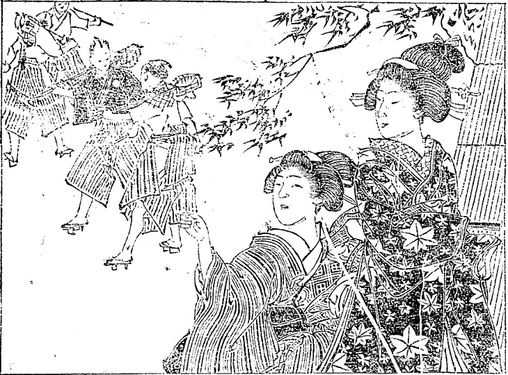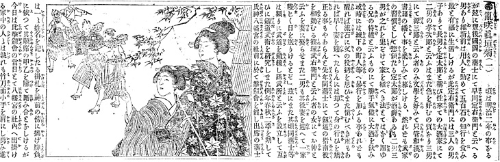 説明 〈遡及資料〉「頃は明治二年の事なるが」と冒頭にはっきり断っているが、豊後国岡藩という地方ではまだ江戸時代そのまま。大阪からはるばるこの地の武家の次男坊のもとに嫁いできた嫁と、付き添ってきた下女。八幡宮で催される撃剣会に集う若侍たちを見やっている。新妻の髪はまだ文金高島田。嫁が年若な場合、当分のあいだ高島田のままでいることは、嫁ぎ先の舅姑に異存さえなければよくあることだった。その場合は眉も剃らず歯も染めないままなので、娘の姿と変わりない。丸髷を結い、縞のきものの下女に対して、きものの柄も派手派手しい友禅風とは、田舎の武士の家風としてはめずらしい。彼方、撃剣道具を肩にした若侍たちは、袴の股立ちを高く引きあげ、高足駄を踏み鳴らしている。(大丸 弘)