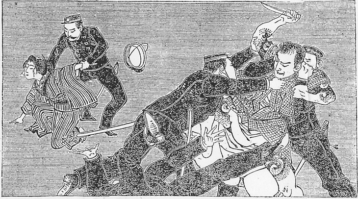 説明 〈遡及資料〉第1回にこの物語の発端は1869(明治2)年とあって、画面もその時代。邏卒(ラソツ)は東京府でこの年10月に三千人が任命されたが、邏卒の制服が制定されたのは1874(明治7)年(→年表〈事件〉1874年2月 「巡査の制服制帽制定」郵便報知新聞 1874年2月13日1面)なので、この服装は誤り。武器についても最初は三尺ほどの警棒を持たせていたため、陰では三尺棒と呼んで馬鹿にする者もいたようだ。邏卒が巡査と呼称を変えるのも1874年。(大丸 弘)