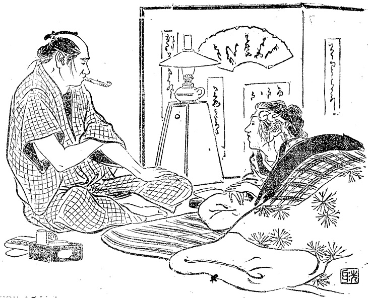説明 〈遡及資料〉挿絵が先行しているので、「挿絵の訳は次回」という断りが末尾にある。1870(明治3)年といっても二人の人間の姿は江戸時代となんのちがいもないが、枕元のランプに時代の新しさを見ることができる。病人は頭痛をやわらげるため鉢巻をしていることが多い。客の男のくわえている煙管はごく短く、これは携帯用のもので、かたわらにそれが入る腰提げの煙草入れを置いている。家でしか煙草を吸わない女性はだいたい30センチ以上もある長煙管を使い、それがよく小道具になる。(大丸 弘)