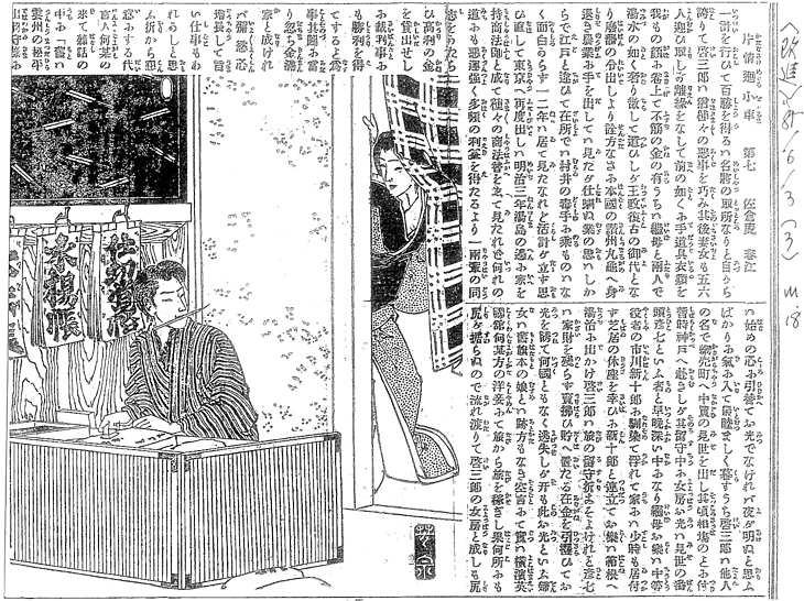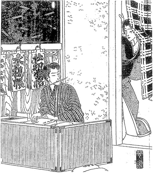 説明 〈遡及資料〉話は長く複雑だが、この場面は東京・蛎殻町の仲買商の女房と、神戸に商用旅行中の主人の留守を預かる番頭とが、「いつしか深い仲になり(……)」というところ。店の奥、結界で仕切られた帳場にいるのが番頭。その奥の内証との間を隔てる暖簾を分けて顔を覗かせているのが浮気女房。小紋のきものに黒繻子の帯を締め、ばかに広い黒っぽい掛け襟をしている。この時代では、東京の商家の女は裾を曳いているのがふつうだった。この女房は眉を落としていない。『守貞謾稿』(1837年~)では、二十歳代の、いわゆる中年増の女で眉を剃らない者は実際にはほとんどいないけれども、絵でそうすると三,四十代の女に見えてしまうために、絵のなかでは若い女房をしばしば眉を付けたままに描いている、と言っている。(大丸 弘)