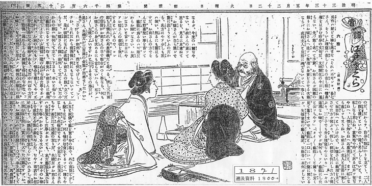説明 〈遡及資料〉「明治四年(1872年)の正月四日」という日付のついた本文。芝で芸者のお披露目をして間のないヒロインが、姉芸者のなじみらしい紳士のお座敷に呼ばれる。座敷には外に三,四人の芸者がいるらしい。挿絵のふたりの芸者はそろって潰し島田に帯は柳、裾模様のヒロインも、すこしくだけて小紋の姉芸者も三枚襲の春着姿。ヒロインの着ているのはまさか白地ではないが、萌葱とか薄紫とかいう華やかな地色は、挿絵ではふつう白抜きにするしかない。客は「黒羽二重五所紋の小袖に白縮の兵児帯を締め、その頃滅多に見ることも出来ざりし金鎖をだらりと下げた」四十あまりの紳士、というが、絵の表現でもわかるとおり、この時代、四十あまりの男というと、すでに初老に近い貫禄になる。角帯でなく、白縮の兵児帯というのがくだけたところ。時計は男女とも懐中時計だったから、長い鎖を帯に巻きつけたり、首に掛けたりした。森鴎外の『雁』のなかで、和服姿の末造が川岸で時計を見る場面では、わざわざ懐時計と言っている。なんでも袂に入れる当時の人の習慣で、袂時計、という言い方もあった。(大丸 弘)