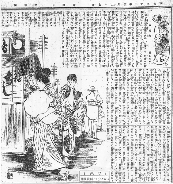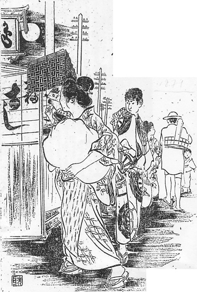 説明 〈遡及資料〉屋台の立ち食い鮨の周りを行き来する人々。手前の大風呂敷を抱えた女は前髪を引っ詰めた中年風の丸髷、浴衣に前垂れ、後歯の下駄を突っ掛けている。後ろでこっちを見返っている男はやくざ風。打ち合わせの浅い大柄の浴衣の肩に手拭いを掛け、一方の手に団扇、一方の手は突き袖をしている。なお、道に沿って並んでいる電柱は、話の舞台の前年である1870(明治3)年に東京・横浜間に開通したばかりの電信専用のものとしては、碍子(ガイシ)が多すぎるのではないだろうか。(大丸 弘)