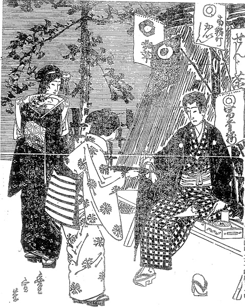 | 説明 | 〈遡及資料〉場所は横浜。埋立地の清正公様詣の途中の掛茶屋で、見知らぬ若い男の蝙蝠傘を取りちがえたのに気づき、詫びて取り替えている伴の下女と、物語のヒロインである十六歳の娘。蝙蝠傘は開化の時代もっとも普及の早かった舶来品のひとつ。もうこの次の年あたりから廉価品の国内製造販売の広告が見られる(→年表〈現況〉1873年5月 「洋服仕立ての広告」東京日日新聞 1873年4月7日2面)。それだけに最初は男持ちも女持ちもない黒の規格品だったのだろう。娘は扇を逆さまに開いて胸の前にかざし、その気じゅうぶんのコケットリー。島田の前挿しはビラビラの花簪(カンザシ)で、単にビラビラとも言っていた。女ふたりは塗りの駒下駄、男には塗りでない桐柾(キリマサ)が好まれた。「人品賎しからぬ士族と見ゆる一個の男」とあるように、明治も初めのころは、旧士族はどことなくそれとわかったらしい。(大丸 弘) |