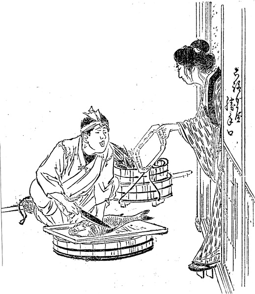 | 説明 | 〈遡及資料〉前の日に注文しておいた鯥(ムツ)が入ったので届けにきた魚屋に調理させている。女の髪は丸髷。襟付きの絣風の柄のきもので、勝手口なので高下駄を履いている。下町のふつうの商家の女房の姿。文中にこの女房の出入りの髪結い云々というくだりがある。この時代女髪結いはたいていは店を持たない外結いだった。髪結い銭を惜しんで一回結うと、それをできるだけ長く持たせるため、「撫で付け」だけ頼むこともあった。この女房の髪がだいぶ乱れているのも、長く持たせているせいだろう。(大丸 弘) |