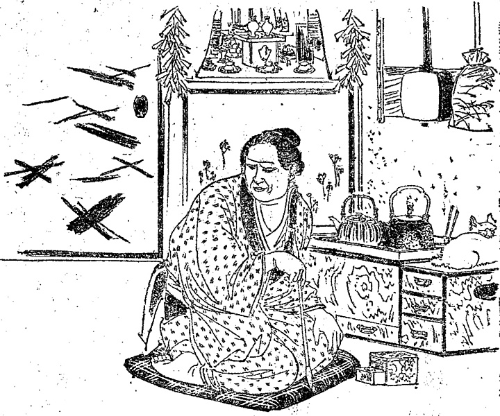 | 説明 | 〈遡及資料〉この絵は、上野の山下でひょっこり出会った、幇間(ホウカン)とその旦那とのとりとめない噂のなかの情景。旧士族の娘が身を落として芸者に出ている。その世話をしているというと聞こえはよいが、いろいろと義理をからめて芸者にとりついて、「慾(ヨク)の学校でもできれば教師にでもなろうという大変な老婆」。芸者はまだ若いが自前で商売をしているらしく、長火鉢の向こう側、神棚の下が家にいるときの居場所なのだろう。長火鉢の、机でいえば袖に当たる部分は小抽斗(ヒキダシ)になっているのがふつうで、その上を猫板というが、この挿絵ではまさに白猫がうずくまっている。文中で幇間がこの芸者を褒めて、「あれは旧士族さんか何かなんで、はじめの裡(ウチ)は御座敷に出ても手を斯(コ)う逆に突きましたが、アレは中々突けるものじゃアありませんよ」と言っている。貴人の前に出たとき畳に置いた手の指先を相手の方に向けず、逆に置く作法は、それでも明治期の挿絵ではかなり認めることができる。(大丸 弘) |