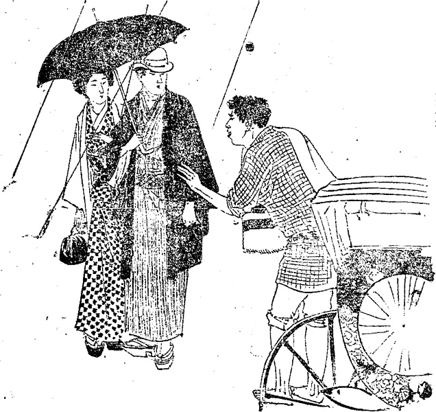 説明 〈遡及資料〉上野の寺の墓参から立ち戻った夫婦が、にわか雨にあったところを折良く車屋に出会った。車夫は太い筋の二本入った特徴のあるブランケットを肩に掛けている。客待ちしている間は寒さしのぎにこれにくるまり、客を乗せるときはこれで客の膝を巻く。「押しつけられて気味の悪いようなブランケットを膝に掛けられ」とあるように、初期の人力車は衛生面についても、強引な客引きでも悪評が多かった。車夫は、筒袖の腰切半纏に股引をひざまでまくりあげ、裸足のようだ。〈車夫規則〉が公布され、人力車にも車夫の身なりにも一定の統制がおこなわれるようになるのは1880年代初めのこと(→年表〈事件〉1883年1月 「人力車取締規則施行」1883年1月1日)。(大丸 弘)