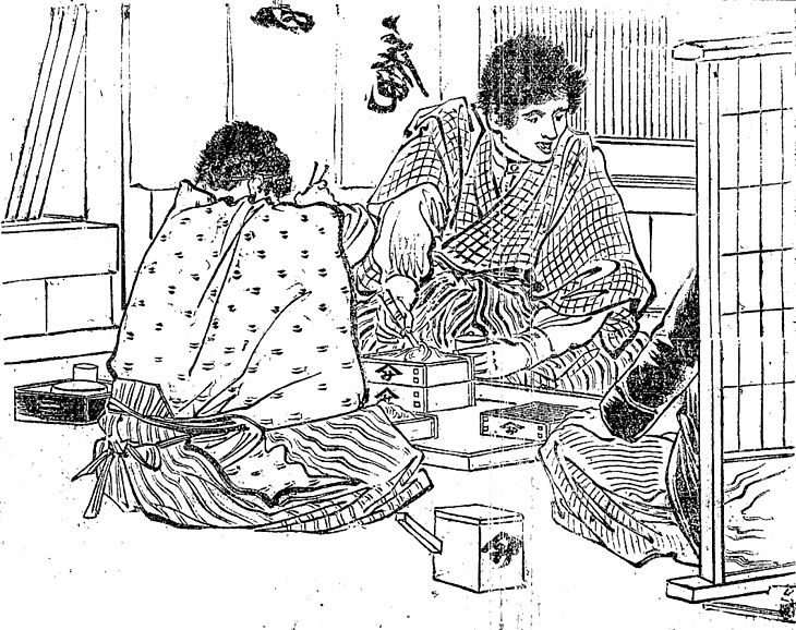 | 説明 | 〈遡及資料〉上京して知人のもとに預けられている中学生が、蕎麦屋で友人たちに大盤振る舞いをしている。中学生にしては大人っぽく描かれているが、この時代はおじいさんのような中学生もいたらしい。この話の主人公は懐具合が良いが、ふつうの書生といえば絣か双子縞などのきものに袴を穿き、詰め襟風の、カフスのあるシャツ――つまりYシャツを着ている。学生の場合その下に肌着は着なかったし、そのYシャツも滅多に洗わなかったらしい。これはそれまでの日本人が、襦袢の類をあまり洗濯しなかった習慣だったためもあろう。(大丸 弘) |