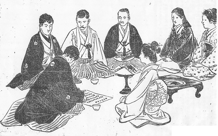 | 説明 | 〈遡及資料〉名望家のもとへ相当の持参金を持って婿養子に入るという、その契約の場面。右から二人目の女性はこの家の当主である未亡人。夫を失った中年以上の女性が切り髪でいるのはめずらしくないが、肩にかかるような総髪で被布姿というのはずいぶん仰々しい。手前の、これから婿を取る娘は高島田で、あるいは白無垢の三枚襲(同じ形の上着・間着・下着)であるかもしれない。この時代は正月とか晴れの場には三枚襲がふつうだった。娘の冒しがたい姿と衣紋描写の手に入った筆の跡、みごとな富岡永洗の作だ。(大丸 弘) |