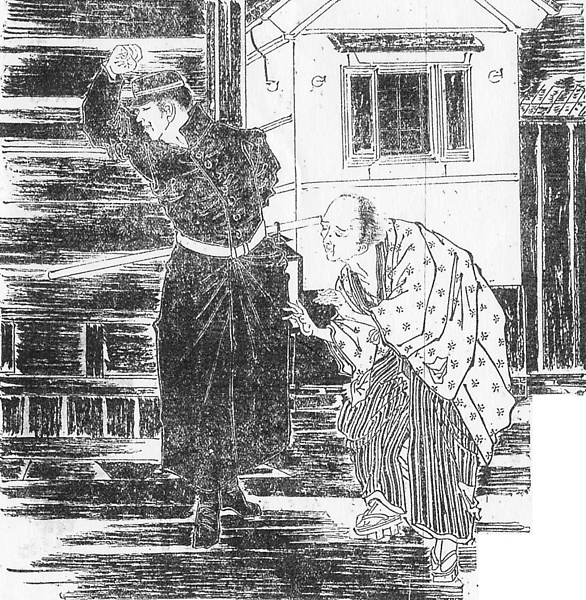 説明 〈遡及資料〉悪者に手ひどく痛めつけられて倒れていた老人を、来かかった巡査が介抱する、という場面。巡査のポーズは芝居がかり。巡査は警棒を携え角灯を提げている。巡査がこの時代に用いた武器としての警棒は「官棒」と呼んだがあまり威力がなく、1883(明治16)年には廃されて帯剣するようになる(→年表〈事件〉1883年1月 「巡査の官棒を廃す」報知新聞 1883年1月10日2面)。また大阪では夜間巡行のさいに靴を草履に変えたことがある(→年表〈現況〉1880年2月 「夜警巡査の靴」朝野新聞 1880年2月7日2面)。それは靴音が相手に悟られやすいため。また角灯が一時丸提灯に代えられたことがあった(→年表〈事件〉1881年1月 「巡査の夜間巡行時、丸提灯を携行」大阪朝日新聞 1881年1月4日2面)。この理由はわからない。警察の制度とともに警官の装備もめまぐるしく変わった。(大丸 弘)