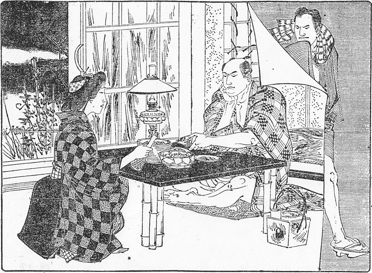 | 説明 | 〈遡及資料〉女の髪は兵庫風、帯は下町の女房ならたいていはそうだった引っ掛け結び。立て膝をして片手は膝に置き、もう一方の手で酌をしているのはもちろん品の良いしぐさではない。凝った意匠の石油ランプ、安くない木を使っているらしい煙草盆、これも凝った脚を使っているちゃぶ台など、調度のひとつひとつに金がかかっているのがわかる。(大丸 弘) |