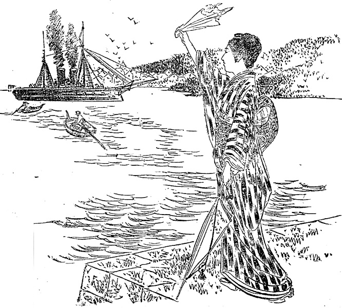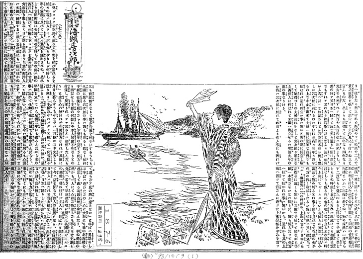 説明 〈遡及資料〉アメリカへ渡って稼いでくるという夫を、横浜の波止場で見送る妻。この女性の髪は上げ巻かイギリス巻の束髪で、ふつうには1884(明治17)年,1885(明治18)年以後の流行だ。束髪はもともと自分でも結える簡単な髪の束ね方で、だからこそ束髪というのだから、こういう時代にこんな髪を結わなかったとはいいきれない。しかし、いくら横浜に住んでいると言っても、洋館勤めの安コックの女房で、貧乏暮らしの女にしては全体にややモダンすぎる。厚い袘(フキ)のあるきものを重ねているのも夏とは見えず、挿絵を描いている富岡永洗の誤解があるのではないだろうか。(大丸 弘)