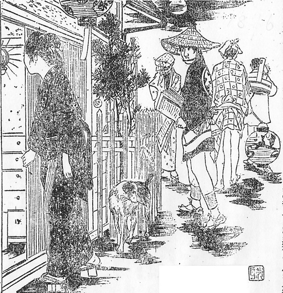 キーワード 新聞売り;菅笠;わらじ;載せ手ぬぐい;置き手ぬぐい;犬