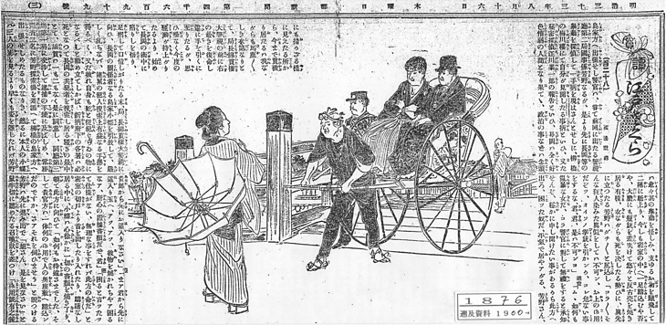 | 説明 | 〈遡及資料〉本文には「吾妻橋の袂にてハタと出会いたる一輌の車の上には角袖の男と相乗りなし、三四人正服巡査に前後を取囲まれて此方に来る人は(……)」とある。角袖は和装のことで、私服の刑事だろう。相乗りの人力車はかなり早い時期から広く利用されていたが、この年1876(明治9)年の11月には和歌山県で男女の相乗りを禁じている(→年表〈事件〉1876年11月 「和歌山県で男女相乗りの人力車を禁ずる」読売新聞 1876年11月13日2面)。記録は知られていないが、和歌山だけのことではなかったかもしれない。日傘を思わず取り落とした女の髪は銀杏返しだろうが、髱(タボ=後ろ髪)も髷もぐっと下に引いた品の悪い結い方。(大丸 弘) |