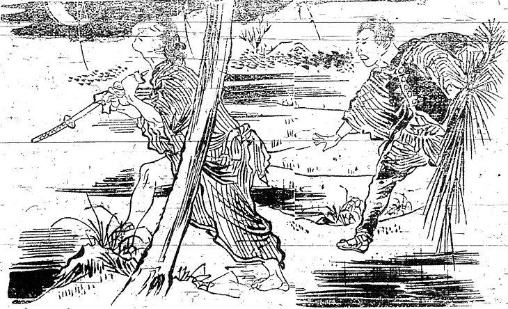 | 説明 | 商売の道には身が入らず、女に馴染んでとどまらない我が身に嫌気して死のうとする若者、それを見かけたひとりの士族が駆け寄って押しとどめる、という場面。今まさに喉を突こうとしている男の方は旧時代と変わりない姿。この時期、散髪への移行がいちばん遅れていたのは商人階級や芸人だったようだ。止めようとする男については「一個の士族」とある。士族風の男、士族体の者、といった表現は、1880年代末(ほぼ明治20年)頃までの新聞のニュース、雑報記事に少なくないが、具体的になにを指しているのかはよくわからない。この場合は紺の股引に草鞋がけ、裾を端折って旅装束風、羽織っているのはこの時代はやった黒羅紗製の袖無し外套、いわゆるトンビらしく、とくに士族を暗示するようなものはない。(大丸 弘) |