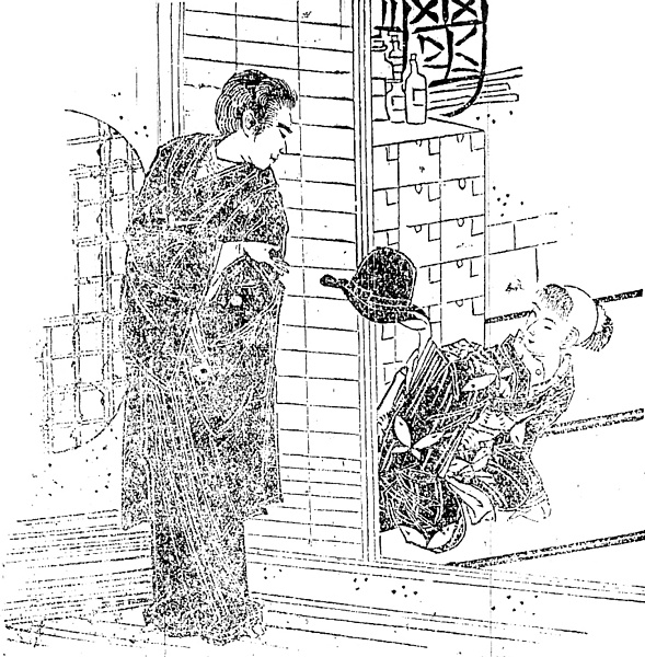 | 説明 | 〈遡及資料〉これより往診に出かけようと玄関の式台に立つ医師に、見送りの少女が帽子を手渡そうとしている。障子の向こうに薬箪笥が見える。この漆塗りの大きな小抽斗(ヒキダシ)が医者の診察室や薬屋の店先の特色で、昭和のはじめまで街角で見かけられた定斎屋(ジョウサイヤ)は、この小型のものを天秤で担いで廻っていた。見送りの子は頭髪をほとんど剃っているので就学前のはずだから、この絵ではすこし大きすぎる。幼い子の頭を剃る習慣は明治期を通じて廃れてしまうが、これは床屋ではなく母親の仕事。そのころまで夫の髭剃りや月代(サカヤキ)剃りは妻のすべきことだったから、剃刀を使えない女はいなかったという。(大丸 弘) |