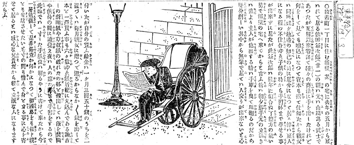 説明 ある家に雇われている人力車夫。もとは由緒ある武士とのこと。この時代地方から上京してきて手に職のない人、苦学生などがいちばん取っつきやすい商売は車夫だった。それには車宿に雇われていわゆる輪代(ハダイ)を払えばよい。そのため需要に比べて車の数が多すぎ、客引きはしつっこく、通行人にはうるさい存在にもなった。個人に雇われている車夫はその点やや格が上で、身なりは客待ちの車夫と変わらないが、饅頭笠に長股引を身に着け、きちんとしている。(大丸 弘)