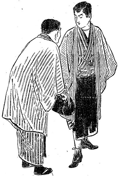 | 説明 | 〈遡及資料〉二人ともかたぎの商人なので、お約束のように縞のきものに前垂れ掛け。左側の年配の男はしがない背負い(ショイ)呉服屋、右の若い男は大蔵省出入りの商人、ということでか短靴を履いている。ふたりのきものの縞は四種類に描き分けている。商人のお仕着せといってもよい縞物はもっとも地味な感じの柄のようでいて、ヴァラエティに富み、野暮にも粋にもなる、趣味の深いものだった。縞の小裂を集めた縞帳も多く残されている。(大丸 弘) |