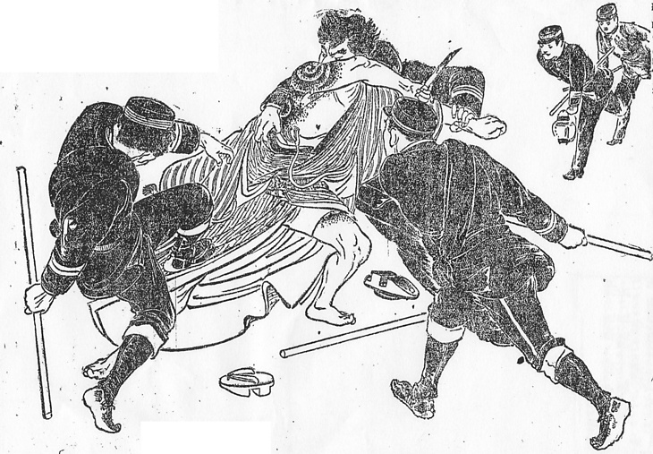 | キーワード | 盗賊;片肌脱ぎ;刺青;入れ墨;半股引;いさみ型;巡査;制服;制帽;足袋跣(たびはだし);犯人逮捕 |