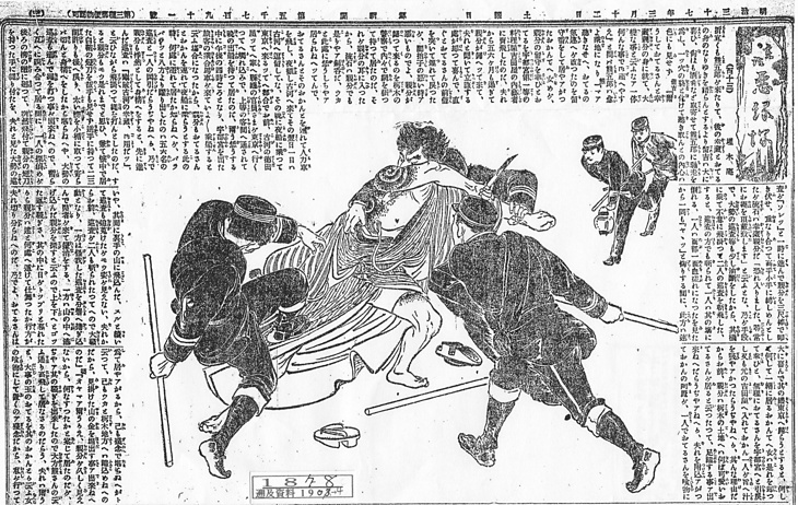 | 説明 | 〈遡及資料〉手配の盗賊古賀の幸蔵の逮捕の場面。片袖を脱いで九寸五分の短刀を逆手に持つ犯人に、大勢の巡査が飛びかかっている。東京ではすでに1874(明治7)年にこの制服制帽が制定され、地方も追々これに準じている。しかし洋服に慣れていないためか、地方によって、また場合によって、いろいろな変更があったらしい。大阪では1880(明治13)年に、夜警巡査は靴音が相手に悟られるからと草履に替えられる(→年表〈現況〉1880年2月 「夜警巡査の靴」朝野新聞 1880年2月7日2面)という風に。この巡査たちも足袋はだしのようにも見える。犯人の穿いているのはパンツではなく半股引だろう。(大丸 弘) |