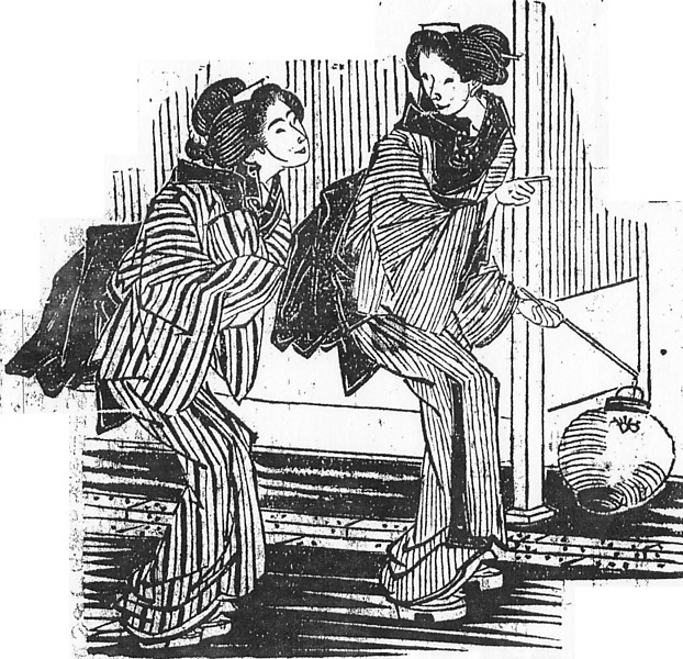 | キーワード | 縞のきもの;黒襟;文庫結び;前裾を引き上げる;腰を屈める;提灯 |