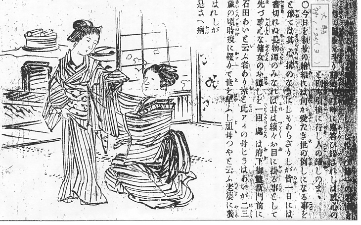説明 主家に尽くした雇い女の美談。紙面が不鮮明で記事の内容が十分にはわからない。大阪府下の商家に奉公した下女が、主人の亡き後、身寄りのいなくなった忘れ形見の幼女をわが力一つで育て上げた。少女はもちろん肩揚げがあるが、髷はもう娘風にしているので十三,四にはなるのかもしれない。幕末からこの頃までの髪は前髪が小さく、ほとんど目立たないものもある。右手で褄を引きあげ、左の手先は袖に隠してなにかの様子をし、それに手を添えて下女が優しく微笑んでいるのは、踊りの所作でも教えているのか。大きな掛け襟に下げ帯にしている下女の方は、眉を剃り、歯を染めてすべて既婚の女の姿。髪は版がかすれてわからないが、髱(タボ=後ろ髪)を下げず、御殿女中のように後に突きだしている。上方風だが、淫らな風に見えないという心がけもあるか。(大丸 弘)