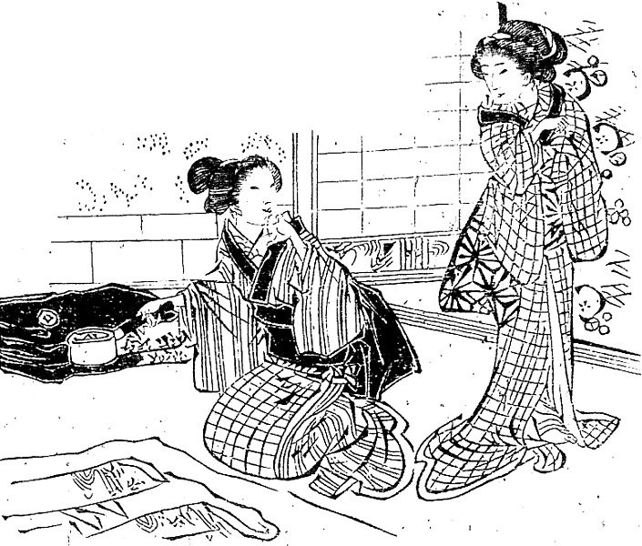 説明 車の中に置き忘れた品物を届けにきた上、礼金を届けるとまたそれを返しに来た正直車屋に感心した大商人が、十九になる妹をその若者の嫁にやる、という話。挿絵はその嫁入り支度の一場面らしい。この時代の東京下町の、裕福な暮らしの人妻と娘の有様が描かれている。嫂が手に持っているのは火熨斗(ヒノシ)、つまり炭火を使ったアイロン。むこうの壁際には黒羽二重の紋服が畳んである。輿入に幾棹かの桐の箪笥に入れてもって来た晴着の大部分は、滅多にない身内の婚礼にでも着て出る以外は、むなしく納戸の中に睡っている。火熨しているのは裾模様らしいが、将来娘が嫁入りの時にでも着られるようにとの用意もあったそうだ。嫂も娘も縞か格子のきものに襟を掛け、同じように裾を曳いている。この時代、帯は人妻も娘もお太鼓風に背負ってしまわず、一般に垂余る部分のめだつ結び方で、娘の方が長く垂らす。(大丸 弘)