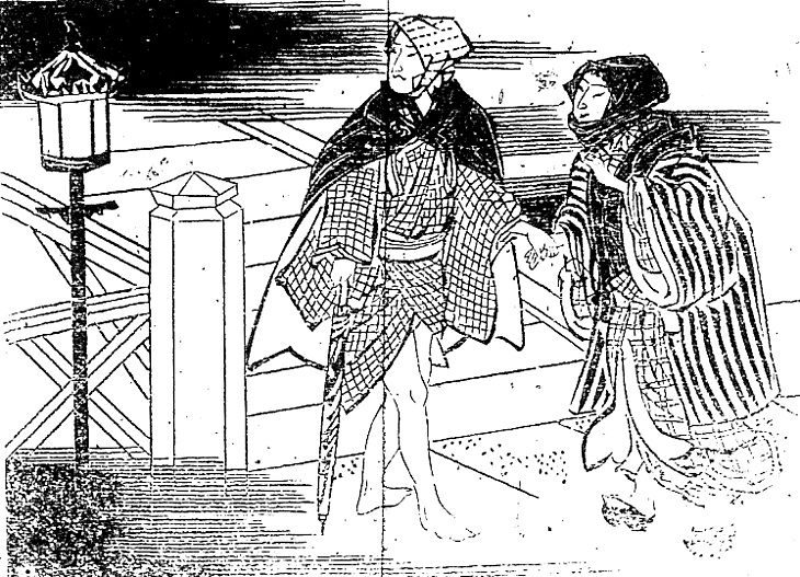 説明 罪を重ねている盗賊が、ひとの女房を騙して道連れにし、蒸気船で大阪へ高飛びしようと永代橋にさしかかる、というところ。この直後に二人は追ってきた探索方に逮捕される。男は豆絞りの手拭いを道行風に頬の辺りで結んでいる。引回し合羽でなく、黒ラシャのマントをはおり、蝙蝠傘を手にしているのは開化風。寒の内だというのに太股も露わな裸足で、この時代の人は街中でも平気で脚を出したり裸足になったりしたから、違式詿違(イシキカイイ)条例などに基づき、官憲がそれを目の敵にした(→年表〈現況〉1878年6月,7月 「裸体・肌脱ぎの勾引」読売新聞 1878年6月26日1面;「酷暑のせいで」読売新聞 1878年8月2日3面)。どてらのような、綿の厚く入った半纏を重ねている女の被っているのはお高祖(コソ)頭巾、しかしどちらかといえばその前身の袖頭巾風。着ぶくれしているにしても女の形があまりに太めだが、こういうスタイルを近代以前の感覚、と見ていた同時代人もあった。(大丸 弘)