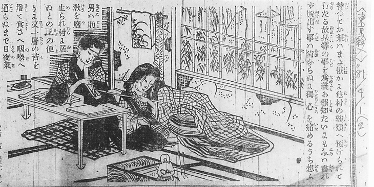 | 説明 | ひととおりの学問があり、学校の助教までした若者だが、いまはこれという職もなく、寺の侘しいひと部屋を借りて住まっているうちに、身持ちのよくない所帯崩れの、「一寸垢抜けした年増といつしか妙な仲となり(……)」という雑報記事の挿絵。これは文字通り膝にすがって、身を横たえている。布団の上でこそないが、畳にじかに寝る習慣の日本人の場合、この状態でもベッドシーンに近いといえそうだ。(大丸 弘) |
