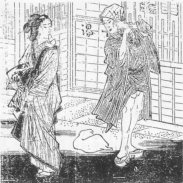 | 説明 | 根津遊廓の娼妓と、下町のしがない花屋の倅(セガレ)の情話。男はいわゆる間夫(マブ)だが、女にとってはタメにならない客、ということで間をせかれ、たまたま女が銭湯に行った帰りにぱったり出会った、という場面。根津はもともと私娼窟で、吉原の真似はしたが吉原のような格式があるわけではないから、花魁(オイラン)が町の湯屋などに行くのだろう。芝居がかりの絵柄で、色男は被った豆絞りの手拭いを頬の横で結ぼうというしぐさ、縞のきものの裾を下帯をちらりと見せるまで捲り、のめりの下駄を直角に開いている。女の髪は根の下がった潰し島田、髱(タボ=後ろ髪)は襟首に付くくらい低い仇な風。右手に湯道具、左手で前褄をちょっと引きあげて、口に巾着の紐をくわえているらしい。足には黒塗りの、小町風の下駄。(大丸 弘) |