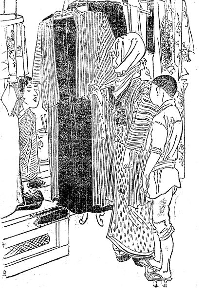 | 説明 | 〈遡及資料〉襦袢に半股引、高下駄を履いた破戒の小坊主を扮装させるため、古着屋で物色している。女の被っているお高祖(コソ)頭巾は、幕末から明治の半ばころまで非常に流行ったもので、「御高祖頭巾の思い出」という懐旧の文を書いた明治二十年代生まれの作家もいる。ただしこの女の被り方はずいぶん雑のように見える。(大丸 弘) |