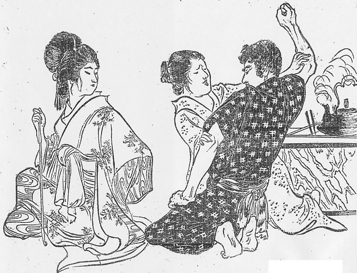 | 説明 | 〈遡及資料〉吉原の花魁(オイラン)から愛想尽かしを言われて腹を立て、拳を振り上げる客の男と、それを押しとどめようとする遣手女。男が袖を肘までまくり上げているのは明治初年に流行った薩摩絣、無造作に締めているのは手綱絞りの兵児帯で、本来書生風だが、年齢にこだわらないので、上野の西郷隆盛像も銅像のきものに絵柄があればこのスタイルだろう。花魁は長煙管を突いて、片方の膝を立てて張り肘するきまったポーズ。髪は兵庫髷の一種だがふつう赭熊(シャグマ)と言っていた。(大丸 弘) |