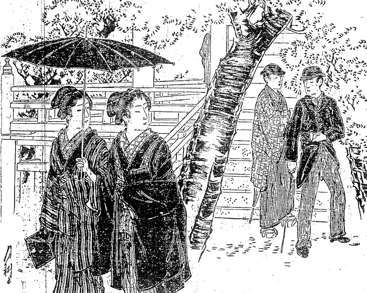 | 説明 | 〈遡及資料〉上野の山の桜見物の散策に行き合う若い男女。二人連れの女性は「年十八九書冊と覚しき包みを抱え語る言葉も媚(コバ)めかぬは学校の生徒らしく形装(ミナリ)は華美(ハデ)ならねど賎(イヤ)しからず」とある。女学生の袴が一般化したのは1900年代(ほぼ明治30年代)になってから(→年表〈現況〉1900年1月 弥生山人「随感随筆」東京朝日新聞 1900年1月7日7面)。初めのうちの女学生は、同年代の一般の娘とそう変わった恰好をしてはいなかった。下町から通う女学生は縞のきものに黒襟を掛け、ここに見るように、きものの襟は広く開けて大きく半襟を見せている。髪は年齢によってさまざまだが、西洋風束髪の出現以前は、二十近ければ銀杏返し、唐人髷が多かった。男性は中折でなくホンブルグ風の丸帽が好まれ、若者でもステッキを用いる人が多く、蝙蝠傘もその代用のように携帯されたらしい。(大丸 弘) |