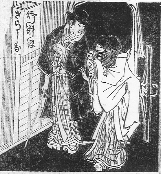 | 説明 | 女房も子もある男が、勤め先へ掛け取りにきた瀬戸物屋の娘と良い仲になって、芝公園の料理屋へちょいちょいしけ込んでいる――という話。年の暮れ時分のことなので男も女も冬装束。娘の被っているのは流行のお高祖(コソ)頭巾、身を屈めて少し恥じらっている風情。男はフェルトの丸帽に首に襟巻をしてステッキを突き、堂島風の下駄を履いている。男の勤める会社は掛け取りが多いとはいえ、盛大にやっているらしいので、一応紳士風の身なり。(大丸 弘) |