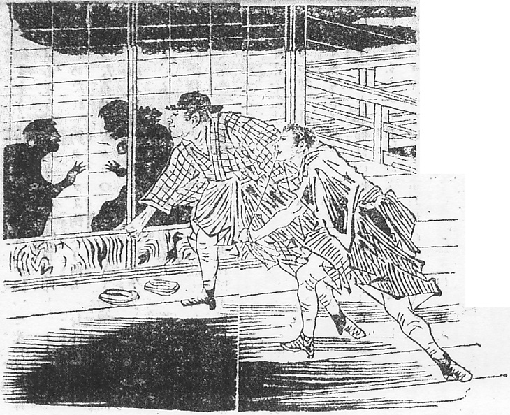 | 説明 | かねて手配されている盗賊二人が旅籠屋で次の仕事の相談中に、探索方二人に踏み込まれ、敢えなく御用になる、という話。盗賊の相談で、箱根の山中に網を張り、通運などの脚夫を脅して運送の大金を奪おう、という話が出る。実際、通運や郵便をねらう盗賊が頻発したため、初期の郵便配達は武装していた。官営のものは郵便であれ、鉄道であれ、お上の仕事なのだから庶民よりは一段上でいかめしく、という感覚がそのベースにあった。郵便切手売り下げ、という言い方もそのひとつ。探索方、つまり刑事巡査の、高帽、羽織袴、靴、というスタイルも特徴的。(大丸 弘) |