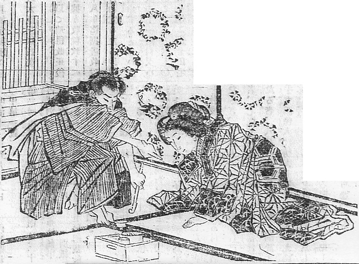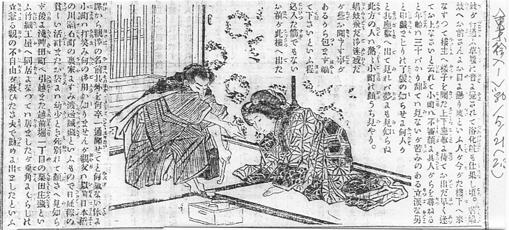 この六枚の挿絵のうち、駒吉お仲の話説と、久次郎の話の、それぞれ二枚が同じ人物。しかし、この四人、描かれた六人の姿は、同一人物といってもよいほど、髪も、着ているものもよく似ている。その中でとくに目につくのは黒っぽいケープだろう。在来型の道中合羽とちがって丈が短く、合羽がたいてい縞物だったのに対し、こちらは黒羅紗製がふつう。この時代、非常によく目にするので流行していたことがわかるが、名前については混乱がある。この形を鳶(トンビ)と呼ぶか、トンビは二重外套のことか、など。どちらにしても断定的なことはいえないだろう。『駒吉お仲の話説』は、はるばる長崎から訪ねてきた人がもてなしを受けている図。『節婦お里の話説』は、久しぶりの帰郷で、老母と積もる話をしている図。そのほかの事例も、このケープが、羽織や被布と同じように、必ずしも屋外だけの外套ではなかったことを示している。(大丸 弘) |