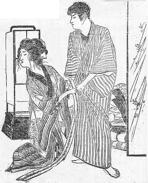 | 説明 | 〈遡及資料〉遊廓で遊んでいた脛に疵もつ男、手の回ったのを知って、慌ただしく自分のきものに着替えている。客は床につくときは一風呂浴びて店で貸してくれる浴衣に着替える。縞の袷のきものに一本独鈷の帯を締め、下には濃い目の色の襦袢を重ねる。女は絞りの柄の長襦袢。女郎の長襦袢は上着のようなものだから、濃い色の襟が掛かり、袖と裾は別布の額仕立。下にもう一枚市松(石畳)の、肌つきの襦袢を重ねている。(大丸 弘) |