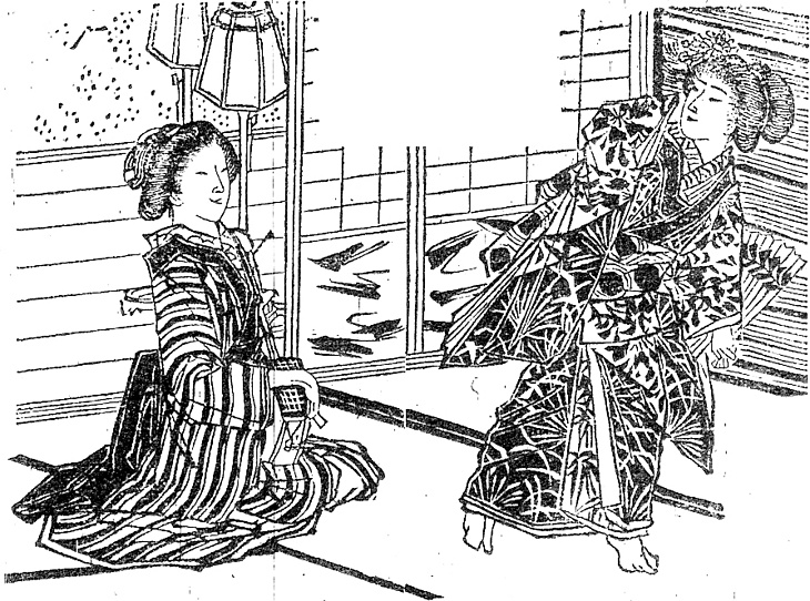説明 芸者上がりの女が器量のよい少女をもらい、いつかはその子にかかる気で一生懸命芸を仕込む。この時代ではごくふつうのことだった。養い親の髪ははっきりとは見えないが、前髪がひどく小さいのは、幕末からこの頃まで根強く続いた一般的風俗。また髷が首筋の方にぐっと下がっているのは、下町風でもあり、大人っぽい、仇な風でもあった。髷の形はその日の気まぐれでいろいろに変えてみても、高さにはその人その人によっての変わらない好みがあった。彼女はまた姿勢が良い。仕込みのときから、芸者は三味線の稽古に背筋をピンとするよう厳しく躾けられる。一見して素人と区別の付く芸者の姿の良さは、背中がよく伸びているため。(大丸 弘)