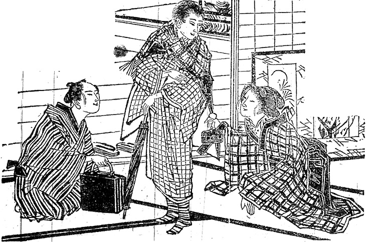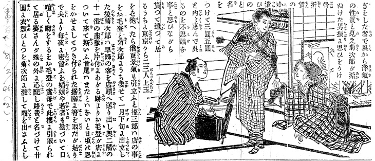 | 説明 | 東京から流れ流れて宇都宮の貸座敷で働いていた男が、主人の目を盗んで主人の女房と道ならぬことをはじめたため、女房の母親が案じて衣類と金を与えて暇を出す。旅立とうとしている男は蝙蝠傘を持ち、髪を総髪にし、きものの肩に大きな格子縞のショールを掛けて、横縞の靴足袋――靴下を履いている。ということは靴履きだろう。別れを惜しむ女が煙草道具を渡している。ショールはだいたいこの時期から男女を通じて利用されはじめた。この男のショールはかなり小さめだが、半身をすっぽり覆うようなものも用いられ、ときには毛布(ケット)がその役目をした。丁髷の男が鞄を渡そうとしている。本文に母親が「二十円と衣類ひとつを渡して(……)」とあるその衣類が入ったものか。見ての感じは革製の、取っ手の付いた鞄とすると、かなり早い例となる。「カバン」という、語源のはっきりしない言葉も、このころから使われ出しているようだ。(大丸 弘) |