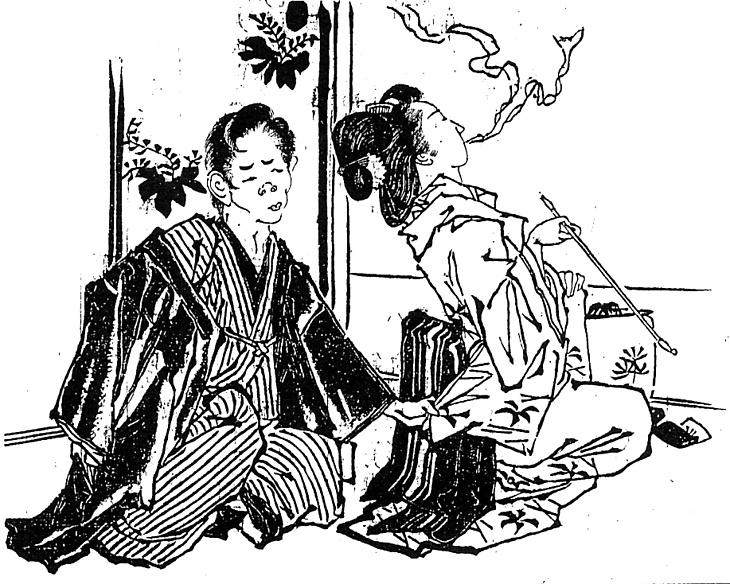 | 説明 | 大阪・道頓堀通りの鍋釜鋳造商の十九になる息子、生まれついての醜男で、これまで女にモテたことなど一度もない。それが廻り髪結いの男に誘われて行った、松島花街のある芸妓にぞっこん惚れ込んだ。小説風の記事は戯文調に書かれることが多く、挿絵はそれに輪をかけてコミカルな筆致のものがある。醜男といえばその特徴は小さな目、反っ歯、下がり眉、そして決定的には天井を向いた鼻の穴。相手にしてくれない女の袂を引いている男の羽織はずり落ちそう。落とし羽織はうつろになった人の心を表す。女の髪は芸子島田、帯は結び下げ。(大丸 弘) |